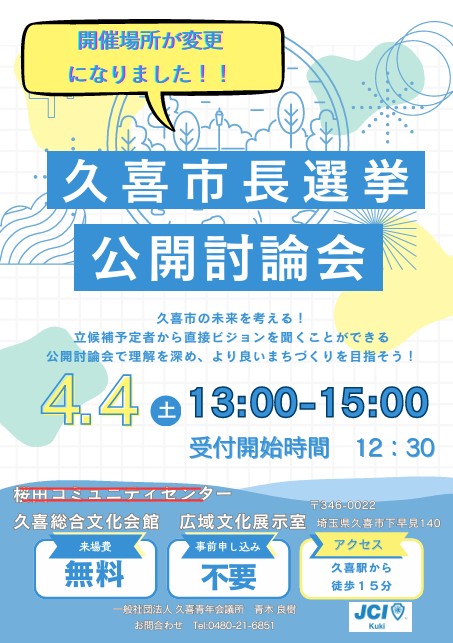 久喜市長選挙の公開討論会の開催案内です。