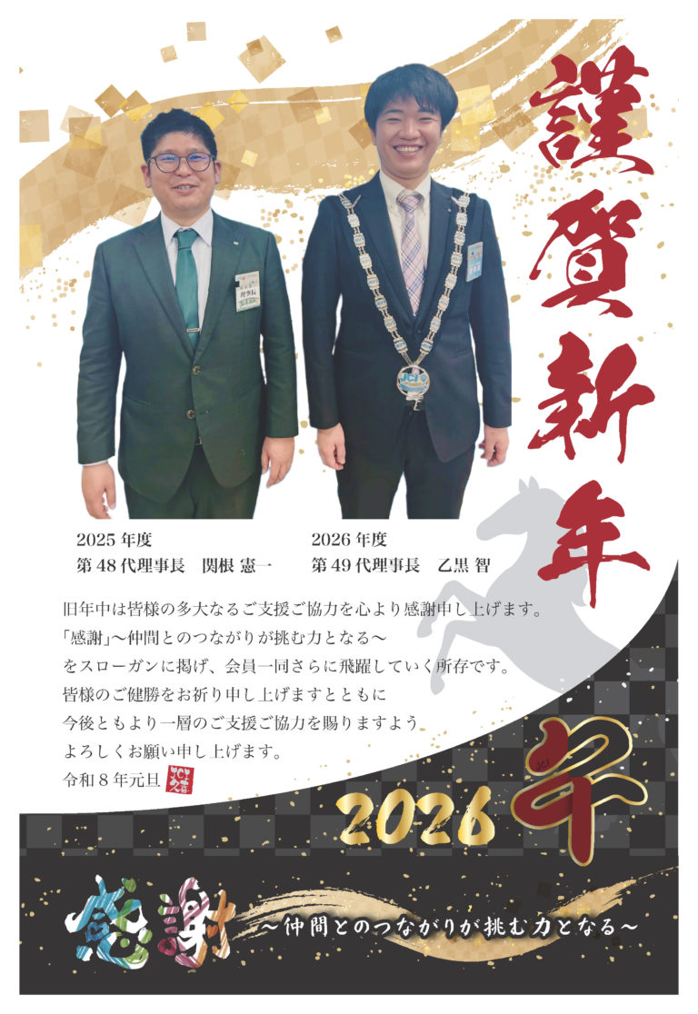 新年のご挨拶 特集 2026.01.012026.01.15 旧年度は皆様の多大なるご支援ご協力を心より感謝申し上げます。「感謝」~仲間とのつながりが挑む力となる~をスローガンに掲げ、会員一同さらに飛躍していく所存です。皆様のご健勝をお祈り申し上げますとともに今後ともより一層のご支援ご協力を賜りますよう、よろしくお願いいたします。令和8年 元旦